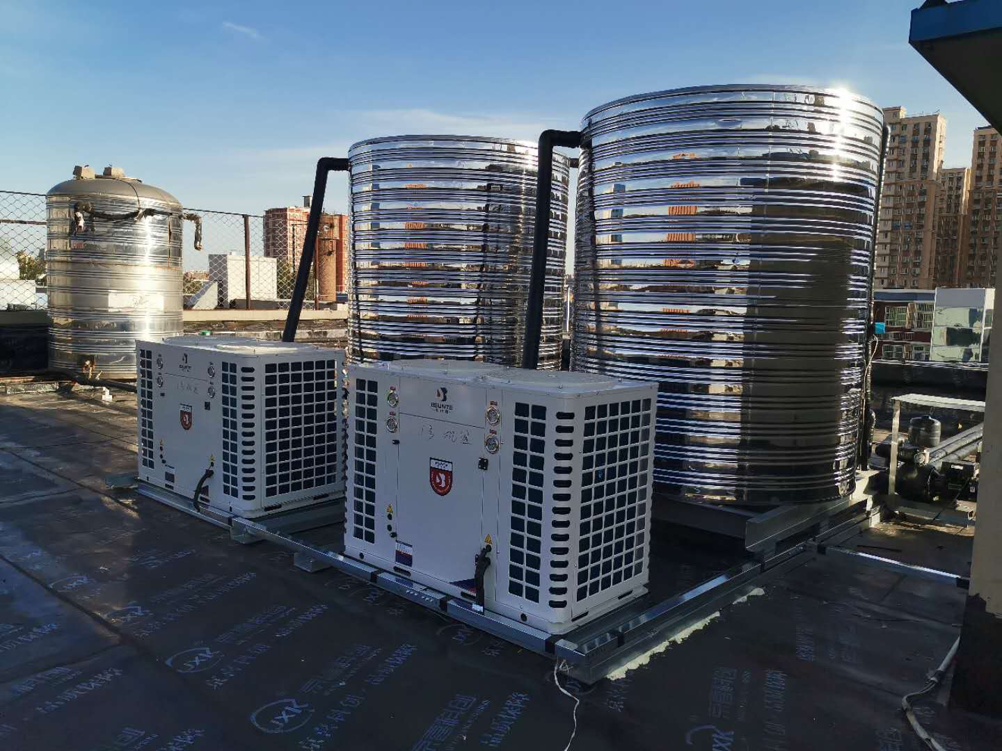 2臺10匹空氣源熱泵熱水機(jī)組安裝于北京市石景山區(qū)古城西路8號朗悅商務(wù)酒店2樓,分別配置兩個6噸不銹鋼保溫水箱。