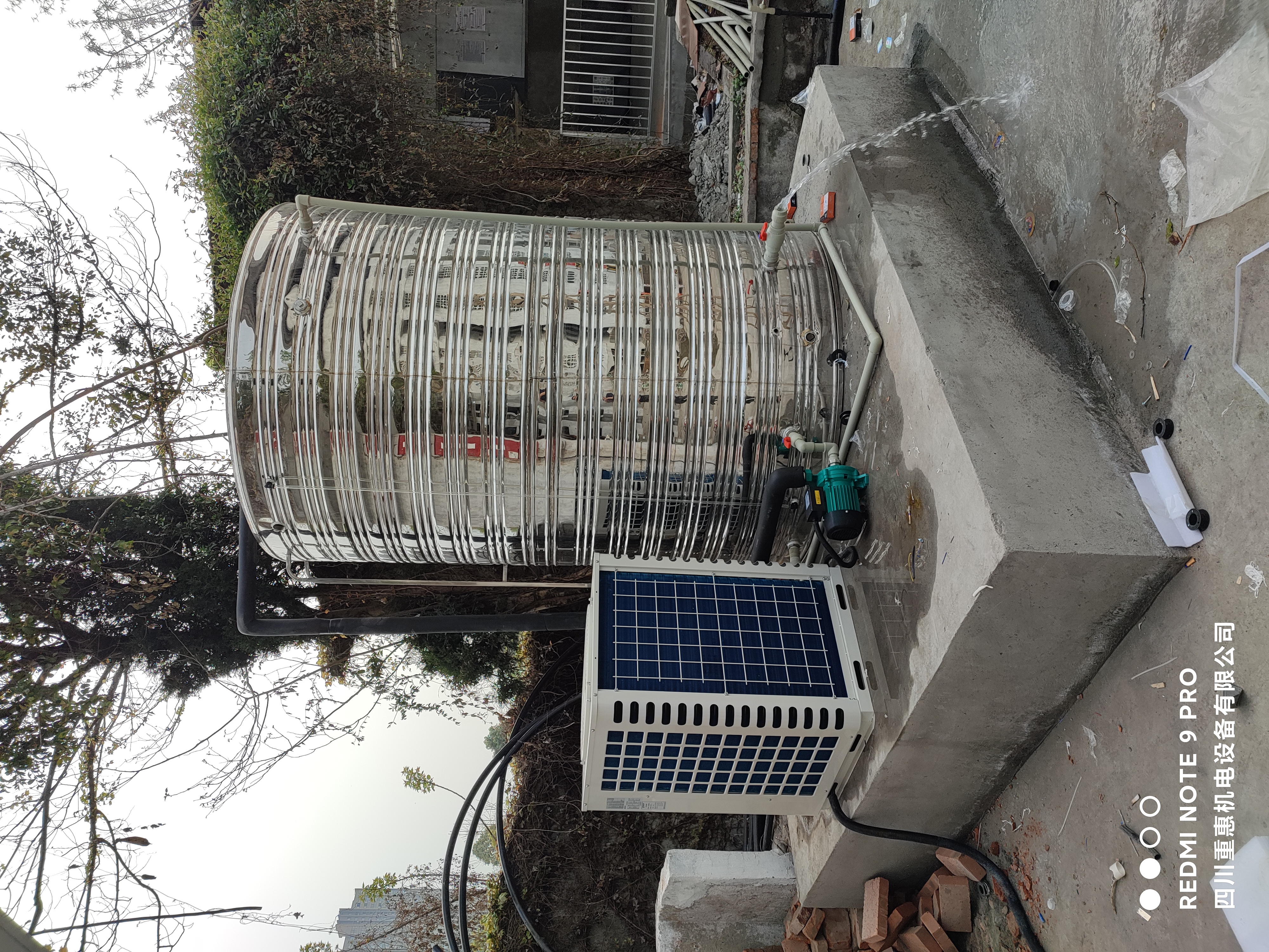 由四川重惠機(jī)電設(shè)備有限公司安裝的5匹空氣能熱水器位于成都市